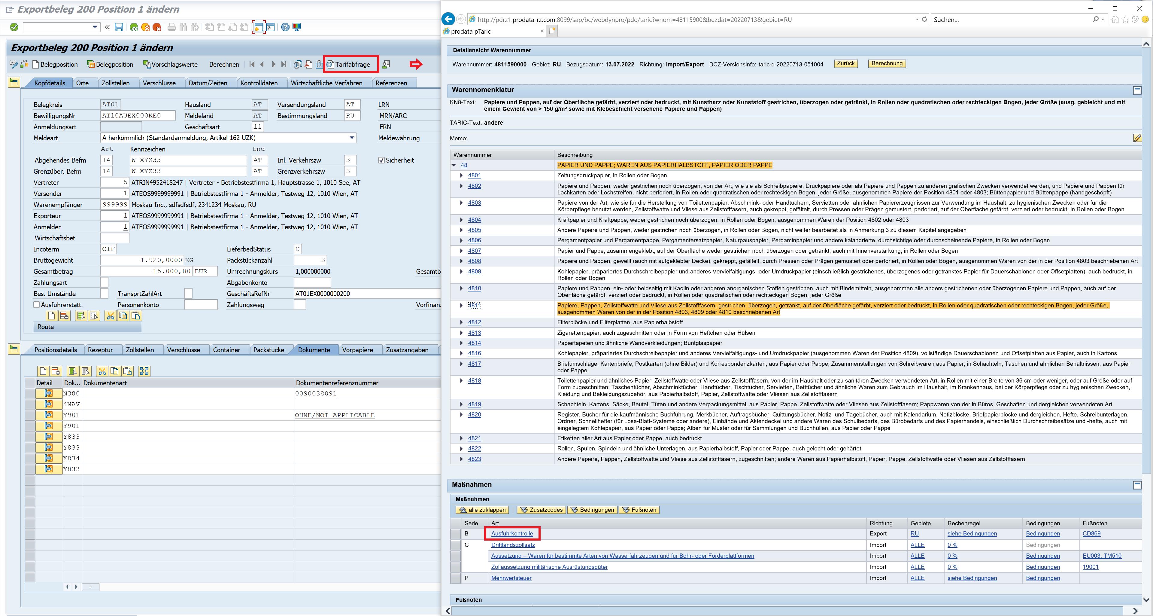Da die Prüfungen auf Grund der Warennummer und des Bestimmungslandes erfolgen, kann mit der Funktion „Tarifabfrage“ (siehe Bild 2) sogleich eine detaillierte Tarifrecherche zu der Ware auf Ihrem aktuell behandeltem Beleg durchgeführt werden, welche Aufschluss über Warennomenklatur, Maßnahmen, Zusatzcodes, Bedingungen, Fußnoten, etc. gibt. Das ist nützlich, wenn man sich nicht sicher ist, unter welchen Bedingungen eine Ware exportiert werden darf oder nicht. In vielen Fällen ist z.b. das Datum des Vertragsabschlusses ausschlaggebend, ob sie ausführen dürfen oder nicht.